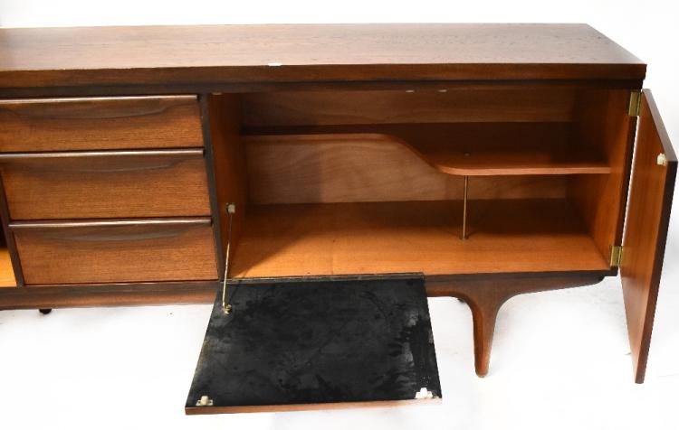 Lot 33 of 998: A mid-20th century teak sideboard comprising three cupboard doors, one drop-down, and three short drawers, on turned tapering legs, 77.5 x 176.5 x 45cm.