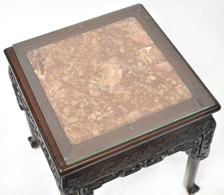 Lot 36 of 998: An Oriental hardwood marble topped jardinière stand with rounded square rouge marble inset panel to the top, carved frieze, raised on ball and claw feet, 49 x 42 x 42cm. Provenance: Part of the Paul Lightfoot Collection.
