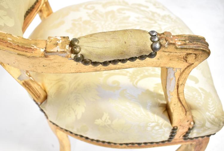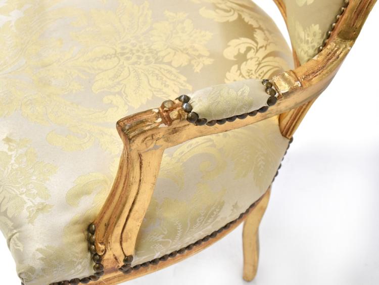 Lot 38 of 998: A 20th century gilt framed fauteuil chair with overstuffed seat, upholstered in pale buttercup yellow damask, to tapering reeded front supports and peg feet.