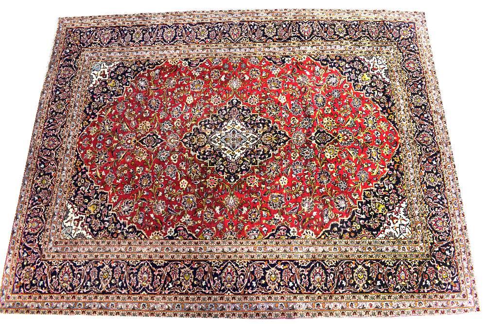 Lot 54 of 998: A hand knotted red ground Kashan Persian carpet, with a central motif within a floral frame and stepped geometric border, 390 x 298cm.