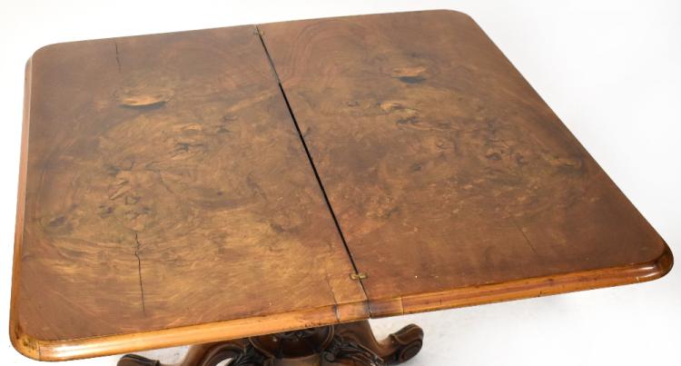 Lot 21 of 1249: A Victorian fold-over walnut card/occasional table on baluster and tripartite support.