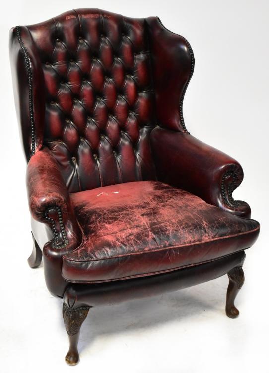 Lot 27 of 1249: A Georgian style button back wing armchair, upholstered in oxblood leather with studs, on carved cabriole legs, width 87cm, and a matching footstool, width 64cm (2).