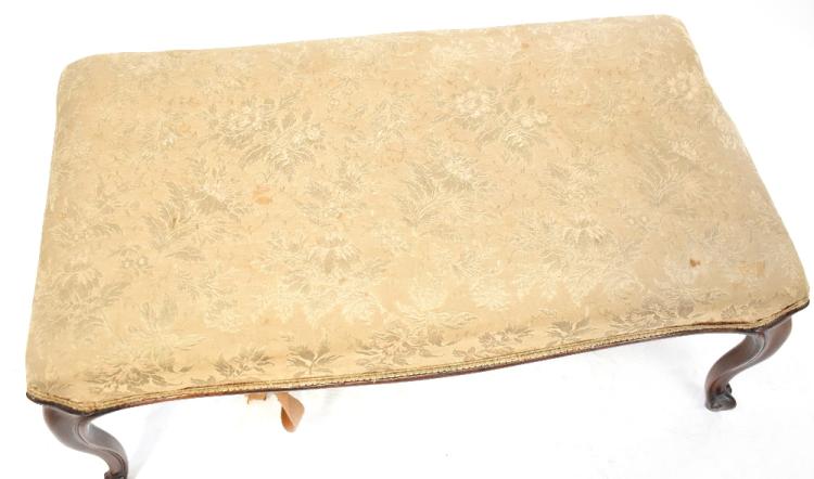 Lot 22 of 854: A BLAIN OF LIVERPOOL; a Victorian mahogany double footstool with shaped apron stamped with the maker's details and raised on cabriole legs to scrolling peg feet, upholstered in pale yellow floral decorated damask satin fabric.