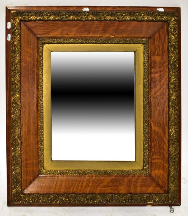 Lot 30 of 854: An early 20th century oak wall mirror with ornate applied gilded decoration to the frame, 82 x 71cm and an early 20th century oak banjo barometer, length 91cm (2).