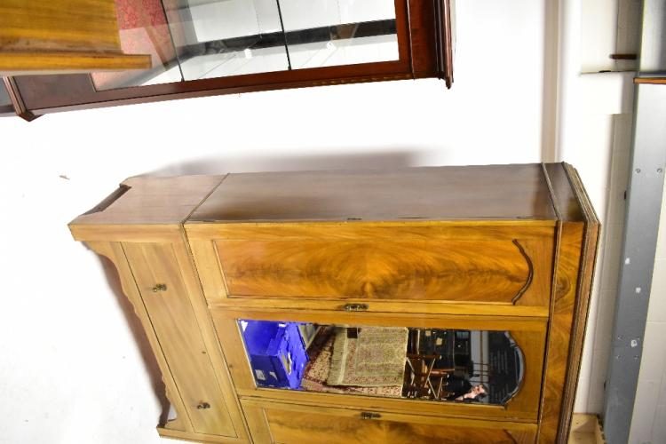 Lot 34 of 854: An Edwardian four-piece bedroom suite comprising a swing mirror back dressing table with serpentine front, two top drawers above two lower drawers, to tapering supports and castors, 155 x 105 x 50cm, a three-drawer chest to tapering supports, 91 x 89 x 49cm, a single bevel edge mirror door wardrobe with arched door to either side, above a long drawer to curved plinth base, 200 x 136 x 45cm and a matching double bed frame, front supports to ball and claw feet, height 89cm, width 139cm.