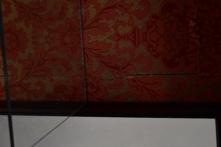 Lot 42 of 854: A 20th century mahogany inlaid and floral painted display unit, the back upholstered in damask fabric, two glass shelves above an oval vignette painted with flora, swags, bows and musical instruments, to tapering block supports and peg feet, 160 x 71 x 42cm.