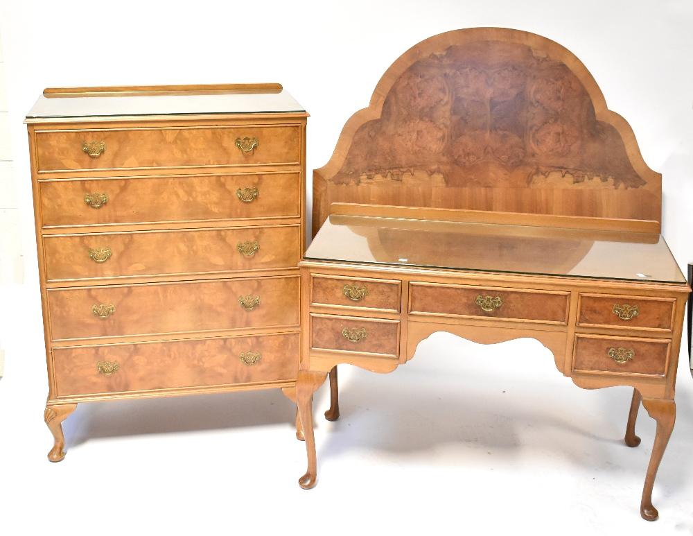 Lot 73 of 854: A reproduction burr walnut harlequin three-piece bedroom suite comprising a five-drawer chest raised on shell carved squat cabriole supports, 117 x 88 x 48cm, a five-drawer dressing table with tryptich mirror, and a double bed headboard with shaped top (af) (3).