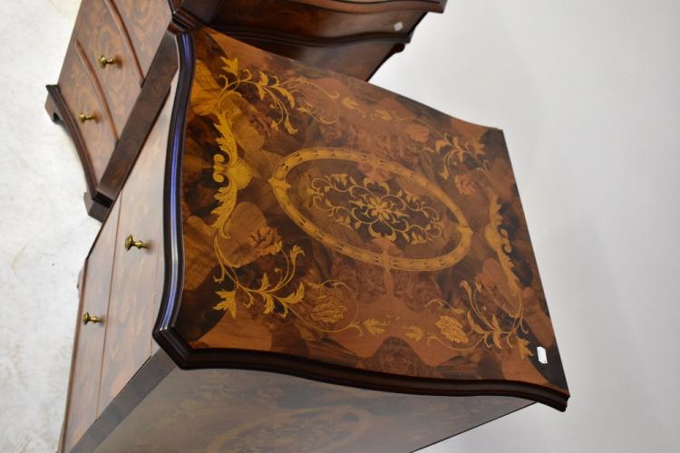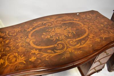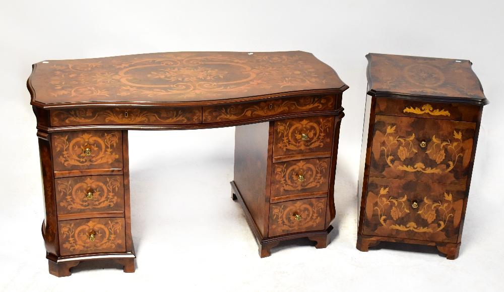 Lot 76 of 854: A contemporary Italian Sorrento marquetry inlaid burr walnut serpentine outlined twin pedestal desk, with pair of frieze drawers above three drawers to each pedestal, raised on bracket feet with ornate floral inlay throughout, 80 x 138 x 71cm, also a similar two-drawer filing cabinet, 80 x 53 x 61cm (2).