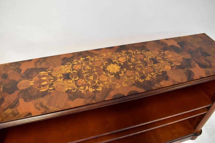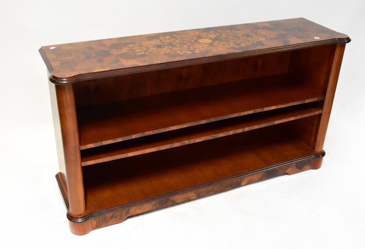 Lot 77 of 854: A contemporary Italian Sorrento marquetry inlaid burr walnut open bookcase, the moulded top above paid of adjustable shelves flanked by rounded pilasters, raised on bracket feet, 80 x 152 x 40cm.