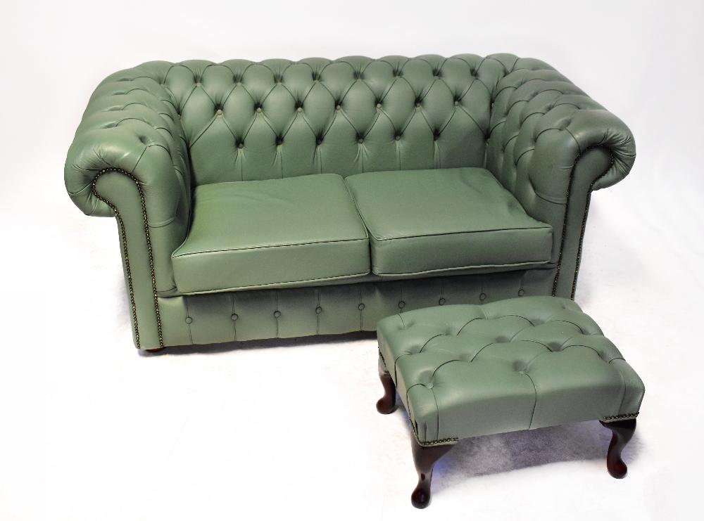 Lot 79 of 854: A sage green leather upholstered two-seater Chesterfield-style sofa, retailed by Designer Sofas for You, and a matching footstool raised on cabriole supports (2).