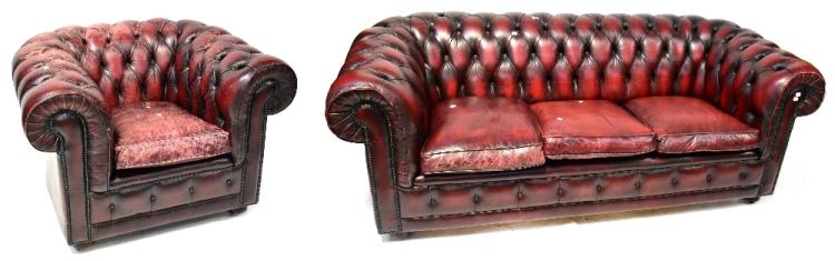 Lot 80 of 854: A three-seat Chesterfield settee, button back and upholstered in oxblood leather, width 209cm, and a matching armchair, width 108cm, both with leather studs and on bun feet (2).