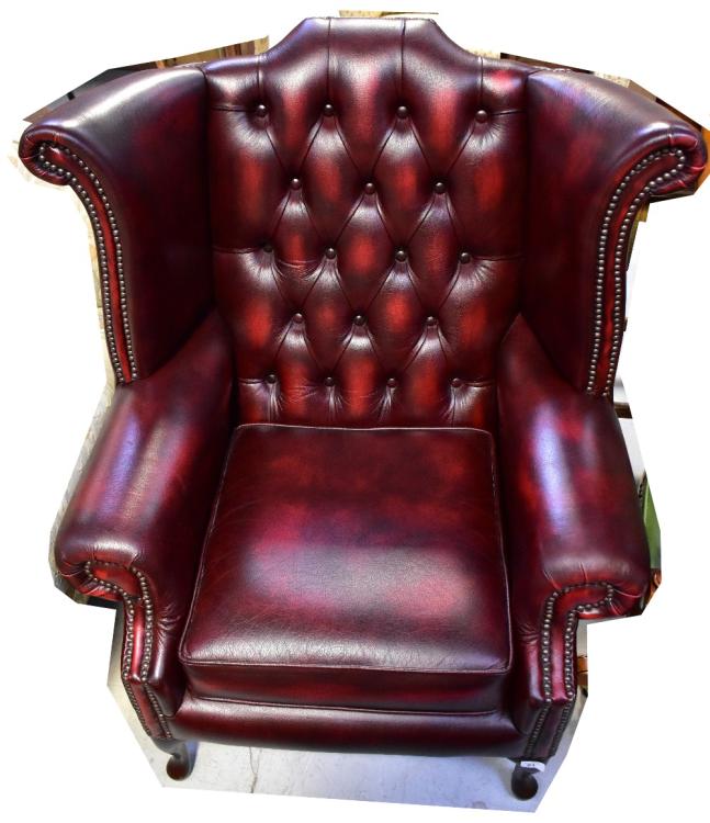 Lot 81 of 854: A contemporary oxblood leather button pressed wingback armchair raised on squat cabriole legs to pad feet.