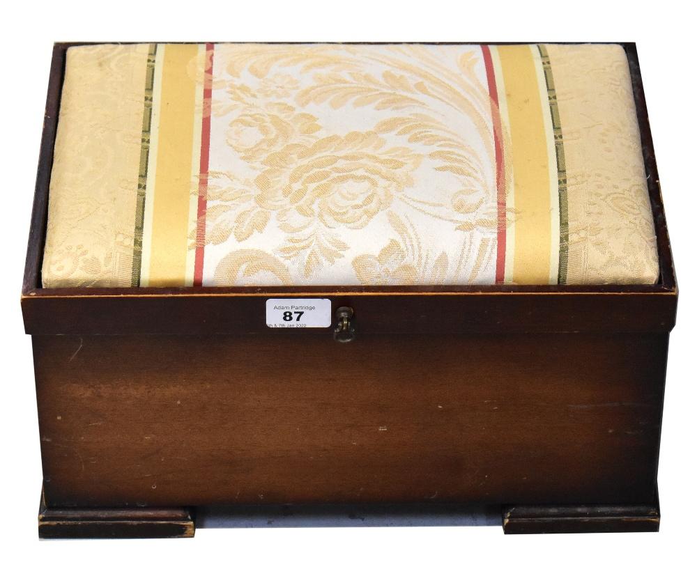 Lot 87 of 854: A mahogany shoeshine box with upholstered top, to four block supports, 20 x 40 x 27cm.