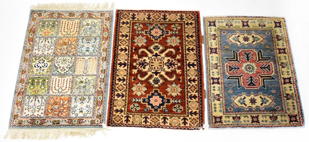 Lot 94 of 854: A small Persian silk rug with floral motifs within squares in floral border, together with two other Caucasian style small rugs, on red ground, 63 x 90cm, the other blue ground, 61 x 89cm (3).