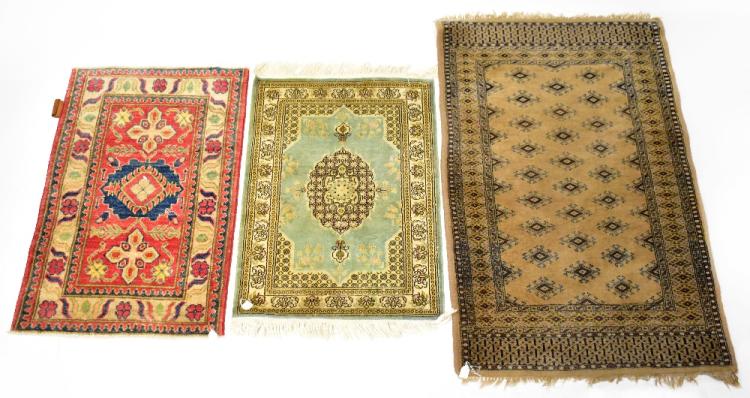Lot 95 of 854: A small Caucasian brown ground rug with diamond motifs within multi-borders, 132 x 80cm, together with two prayer rugs, one blue ground, 90 x 60cm, the other red ground, 97 x 60cm (3).