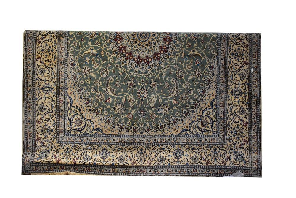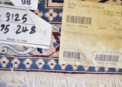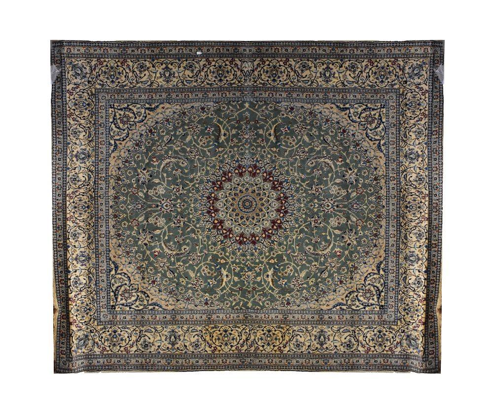 Lot 98 of 854: A large Persian/Iranian Nain carpet/large rug, with a centred sunburst circular panel set within a large oval naturalistic floral panel, with a wide repeating floral border, 300 x 247cm.