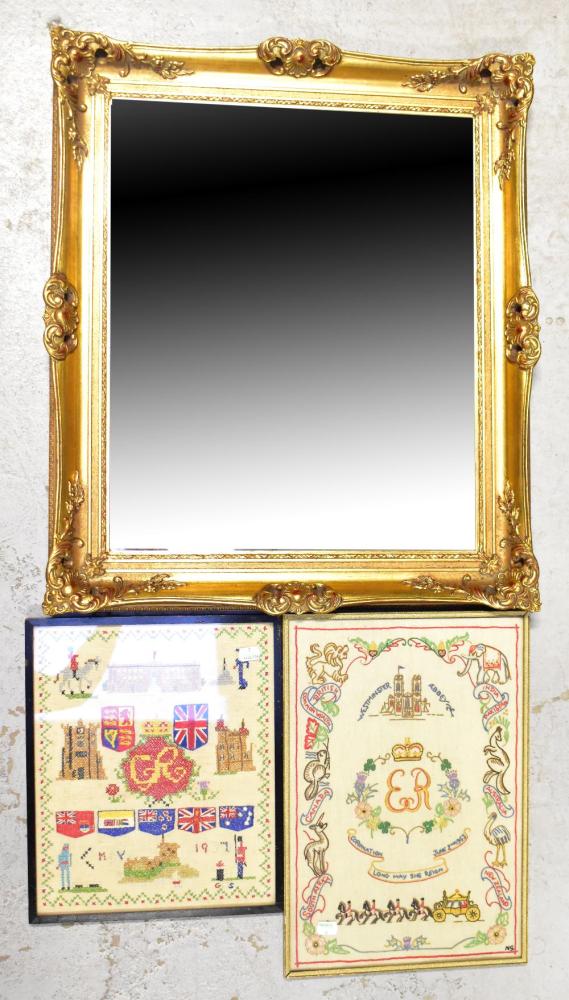 Lot 102 of 854: A gilt framed wall mirror, rectangular mirror plate in frame with shell and C-scroll decoration, together with two mid-20th century needleworks commemorating the Coronations of George VI 1937, with flags, soldiers and castle surrounding central GR motif, and Elizabeth II 1953, with Westminster Abbey and insignia with coach and horses beneath surrounded by a border of Commonwealth countries and animals, 43 x 29cm and 34 x 28cm, framed and glazed (3).