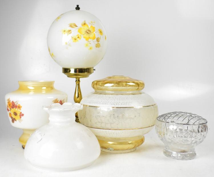 Lot 104 of 854: A brass table lamp in the form of an oil lamp with glass globe flower painted shade, three non-matching glass shades and a cut glass rose bowl.