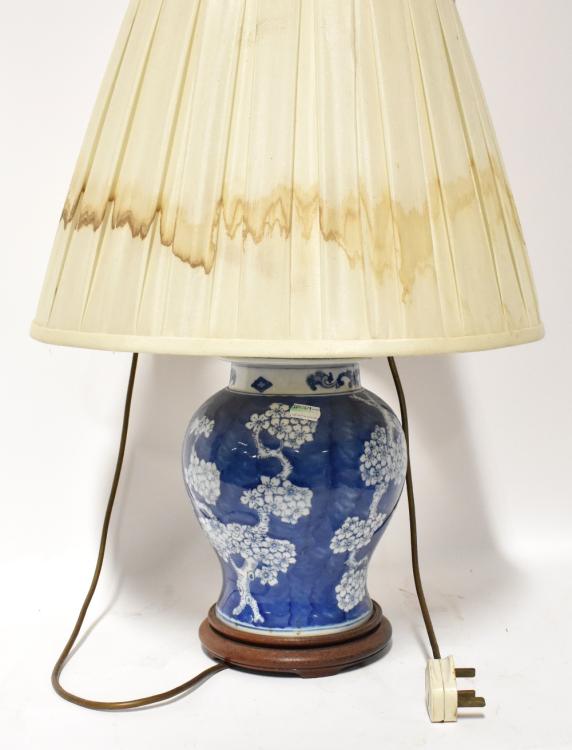 Lot 105 of 854: A Chinese porcelain table lamp in the form of a covered ginger jar, hand painted in blue and white with cherry blossom decoration, mounted on a turned wooden base, height 35cm.