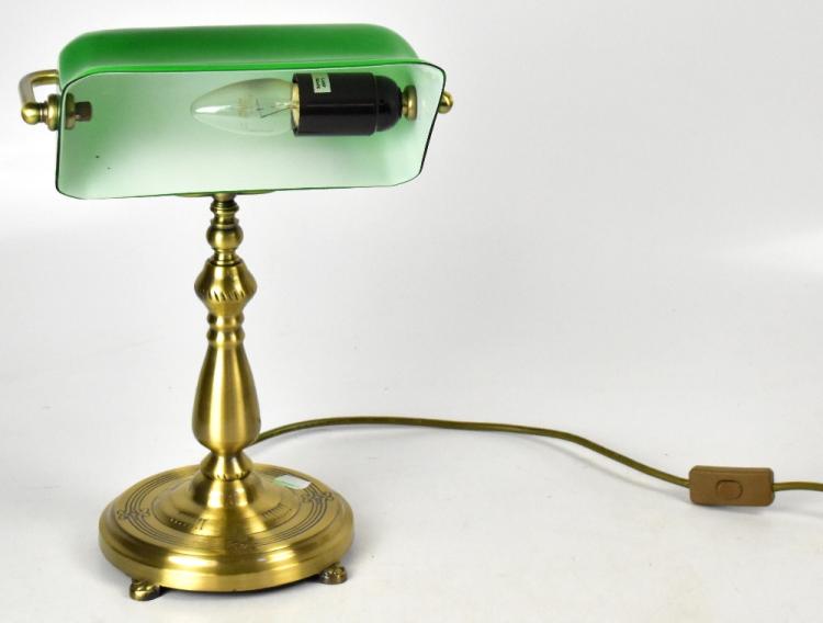 Lot 106 of 854: A contemporary brass bankers' table lamp with green glass shade, height 39cm.