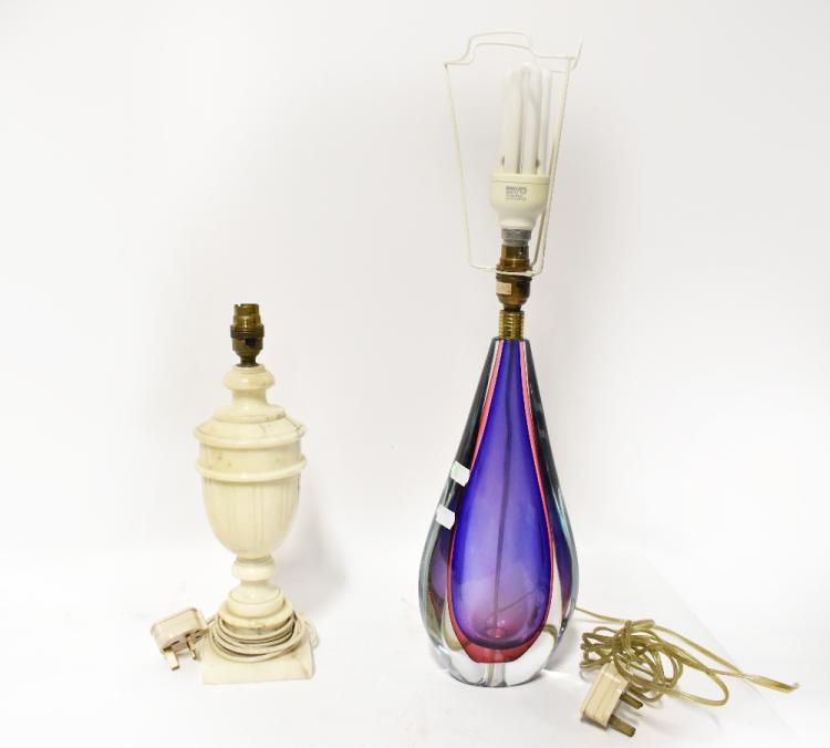 Lot 107 of 854: A mid-20th century cased glass table lamp in a teardrop shape, with clear pink and purple colourways, height 34cm, together with an alabaster Classical urn-shaped table lamp, height 31cm (2).