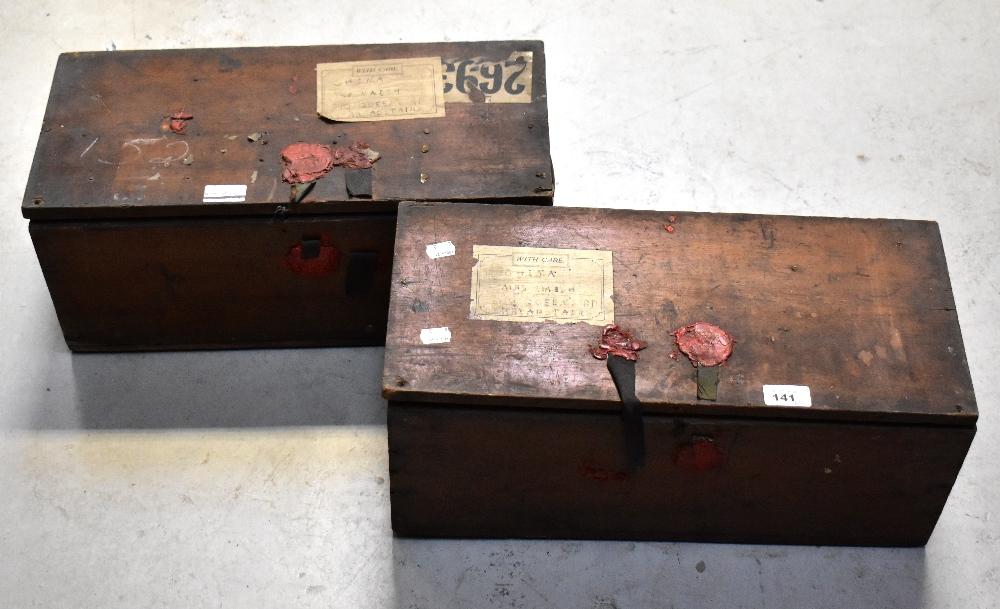 Lot 141 of 854: Two vintage wooden boxes originally used for Royal Worcester figures, each with red seal and black ribbons, 21 x 49 x 22cm (2).