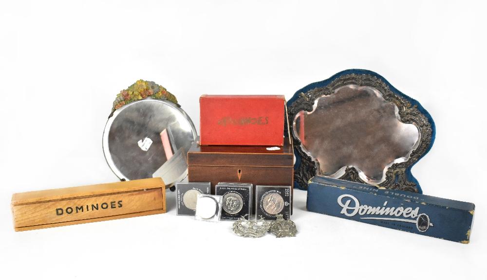 Lot 142 of 854: A 19th century walnut and string inlay twin-section tea caddy, 12 x 19 x 11.5cm, a boxed set of double nine dominoes, a wooden case containing a set of dominoes, a set of dominoes in a red box marked 'Empire Made', five commemorative coins to commemorate the wedding of Lady Diana Spencer and the Prince of Wales 1981, Queen Elizabeth The Queen Mother 1980 and three others, two military badges, both for the 'Scottish Kings Borders Own', also two early 20th century mirrors comprising a scrolling fr