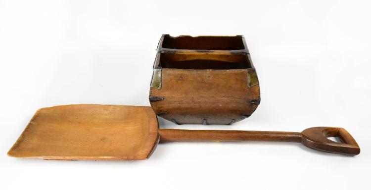 Lot 147 of 854: An oak wooden grain shovel and a large wooden basket-shaped trug in the antique style, with aged metal straps (2).