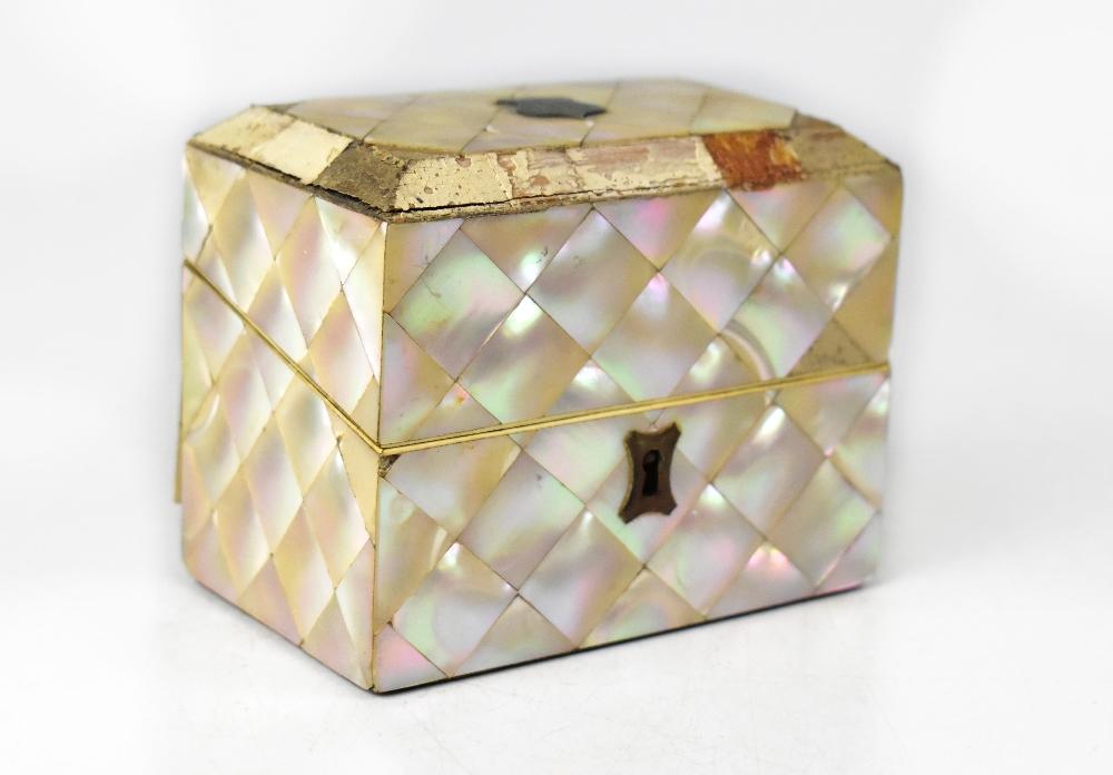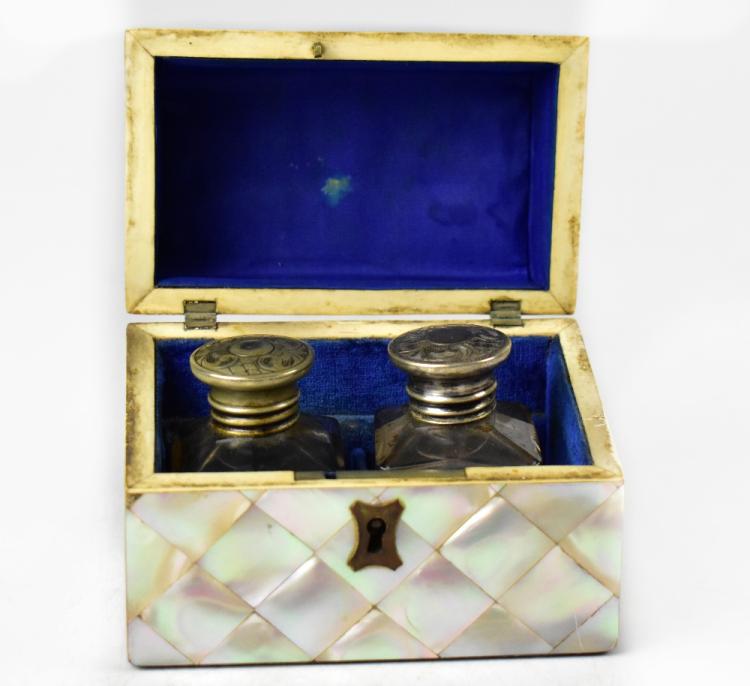 Lot 149 of 854: A late 19th/early 20th century small lidded box clad in mother of pearl panels, the hinged lid enclosing two small square moulded decanters, height 6cm, with floral chased white metal lids and star cut bases, the box 9 x 11cm x 7cm.