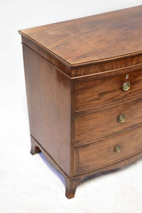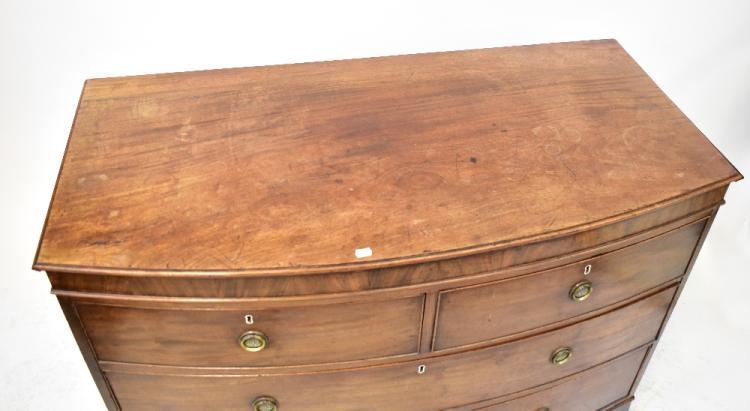 Lot 17 of 1095: A 19th century mahogany bow-fronted chest of two short over two long drawers, with bone escutcheons and brass ring handles, on outswept bracket feet, 95 x 125 x 61cm.