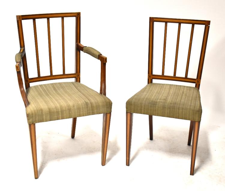 Lot 48 of 1095: A set of six Edwardian satinwood inlaid stick back dining chairs with stuffover seats and tapering front supports (5+1).