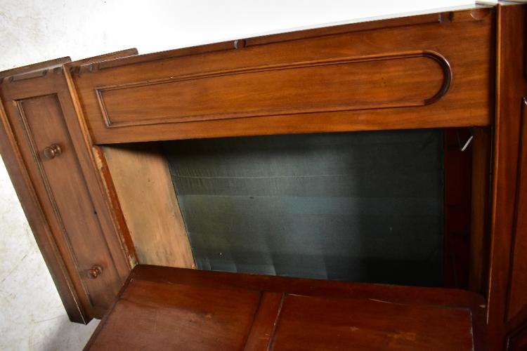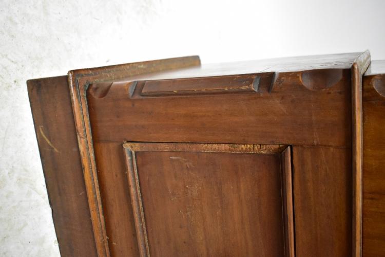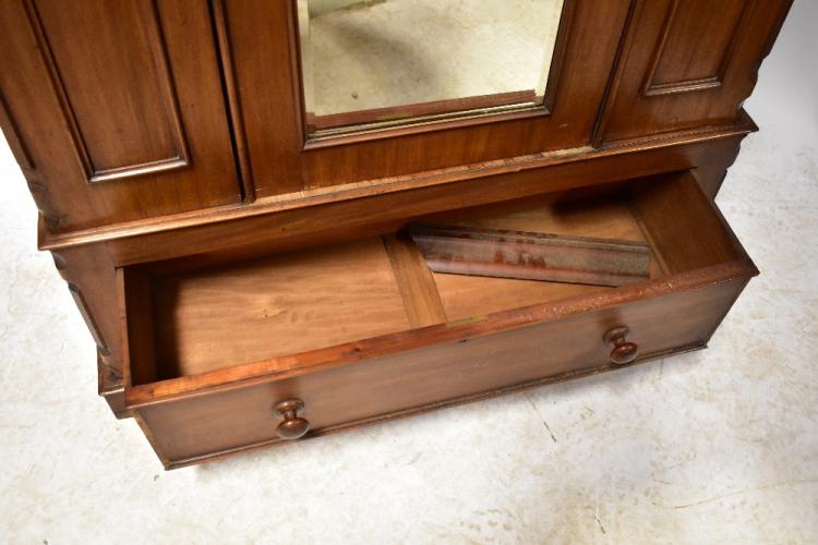 Lot 52 of 1095: An early 20th century mahogany wardrobe, the arched pediment above single mirrored door set with arched bevelled plate and flanked by pair of panelled trims, above a single drawer to plinth base, 210 x 123 x 45cm (af).