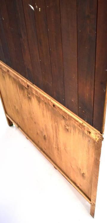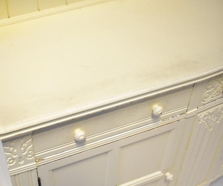 Lot 55 of 1095: An early 20th century white painted dresser, the boarded plate rack above bow-fronted lower section with three frieze drawers, above pair of panelled doors centred with a linen fold decorated panel, raised on stile supports, 192 x 140 x 52cm.