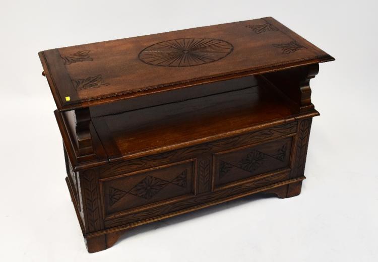 Lot 64 of 1095: A 20th century reproduction oak monks bench, with carved table top and underside, pegged and metal hinges, solid curved armrest, hinged seat revealing storage section, on antique-style panelled base to bracket feet, height to table top 69cm, length 105cm, width 48cm.