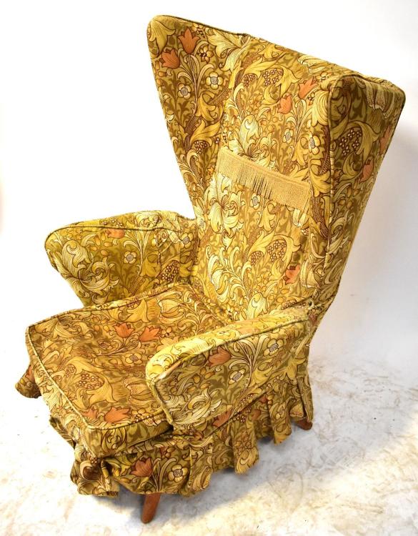 Lot 67 of 1095: A mid-20th century wing-back armchair, upholstered in a woven black and yellow fabric, with a William Morris pattern removable cover, on turned tapering wooden legs, height 110cm.