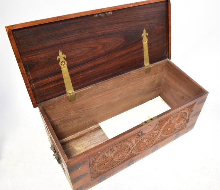 Lot 72 of 1095: A 20th century chest with rectangular lift-up top above carved Eastern-style panels, with heavy iron drop handles and brass bound, 50 x 116 x 51cm.