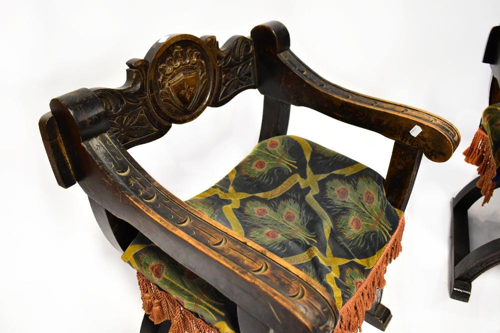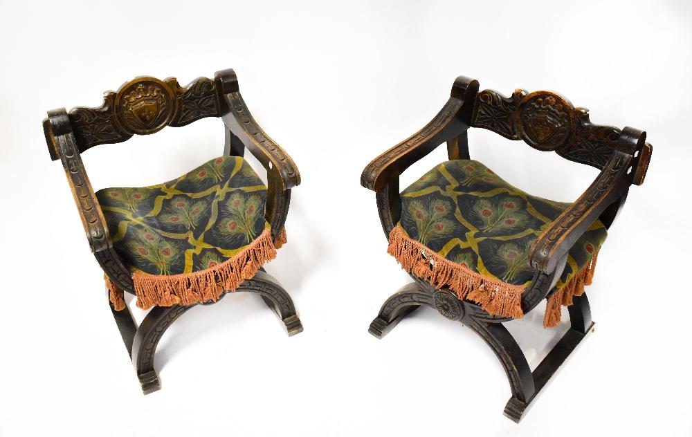Lot 73 of 1095: A pair of dark stained caved oak Savonarola-style X-framed open arm elbow chairs (2).