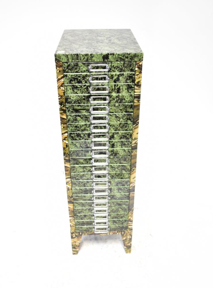 Lot 76 of 1095: A Stor twenty-one drawer metal filing cabinet with military style hydro-print finish, 99 x 29 x 38.5cm.