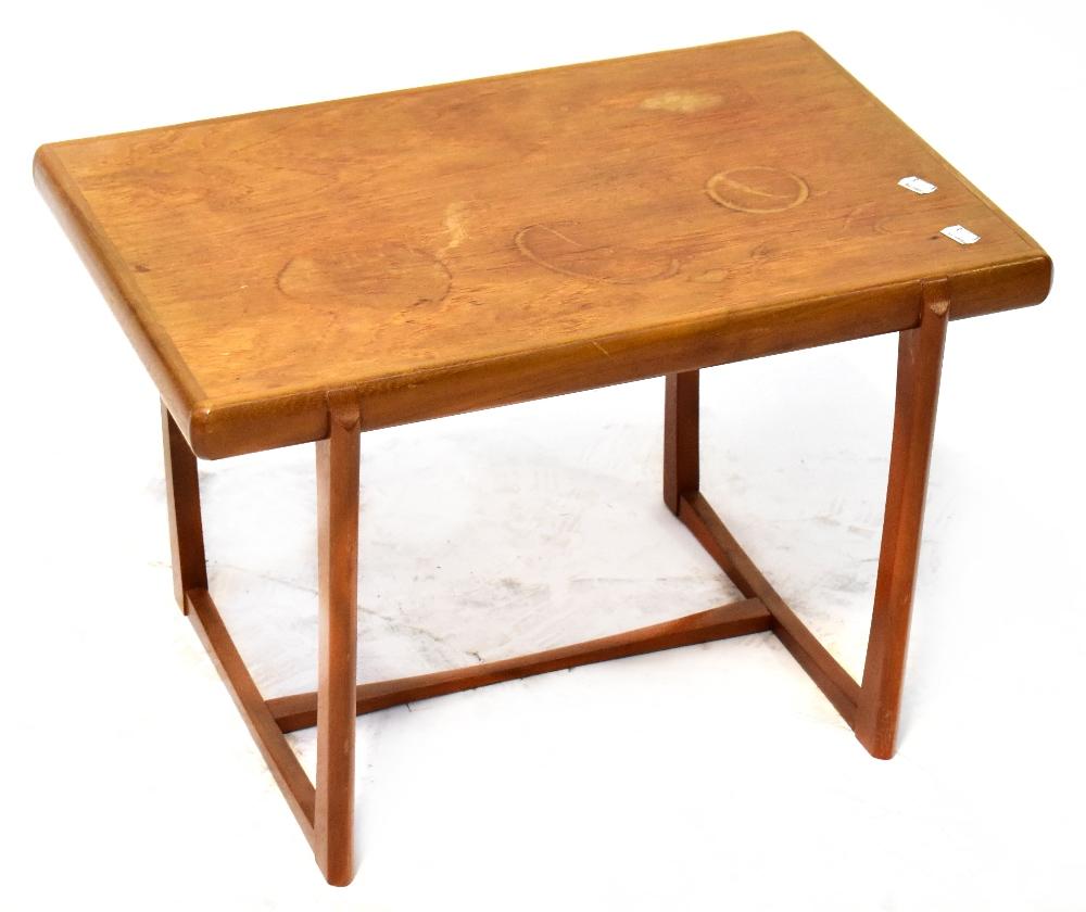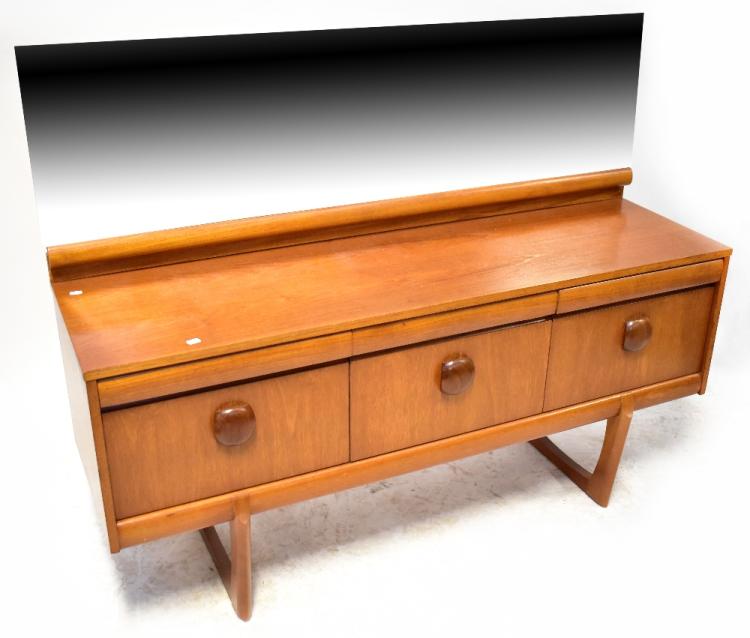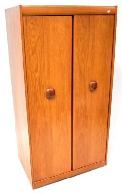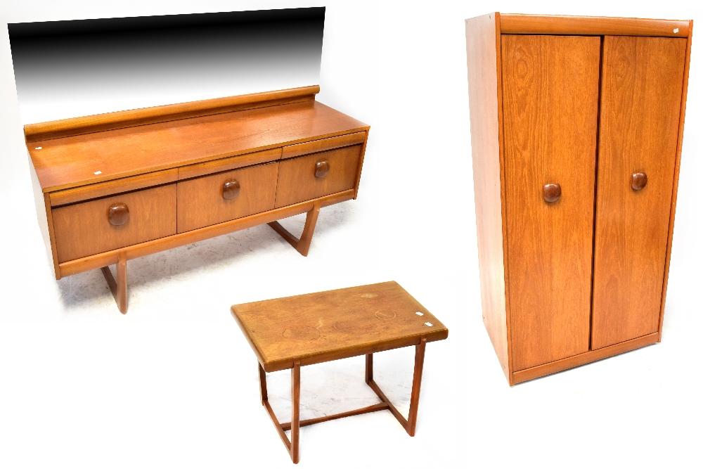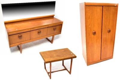 Lot 83 of 1095: A retro 1970s teak two-piece bedroom suite comprising two-door wardrobe and a mirror back dressing chest and a small side table (3).