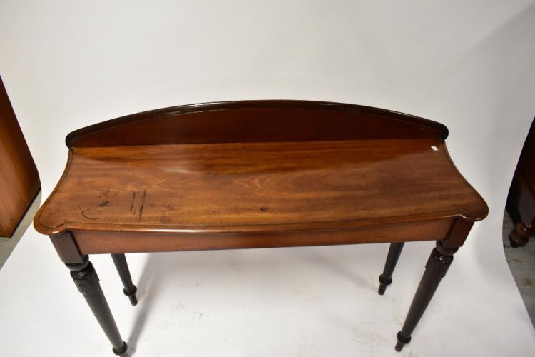 Lot 8 of 1061: A 19th century mahogany console table with arched back, shaped top, raised on carved and turned tapering supports to peg feet, 107 x 137 x 42cm.