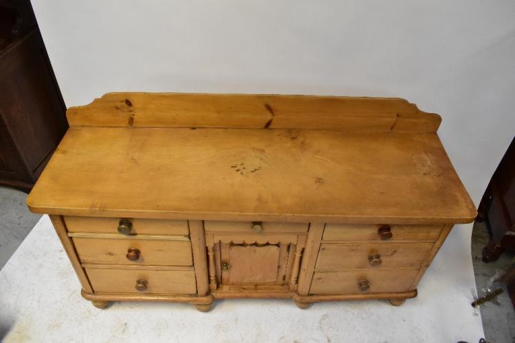 Lot 13 of 1061: A late 19th/early 20th century large rustic kitchen dresser base, possibly sycamore and pine, the substantial, possibly one-piece top with back rail over central drawer over cupboard, with spindle columns flanked by two banks of three drawers, wooden turned handles, on baluster turned supports, 104 x 178 x 55cm.