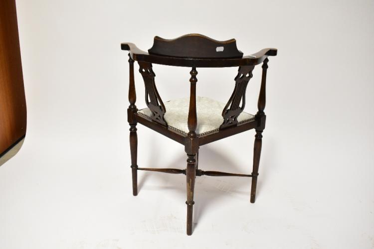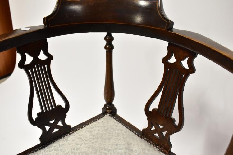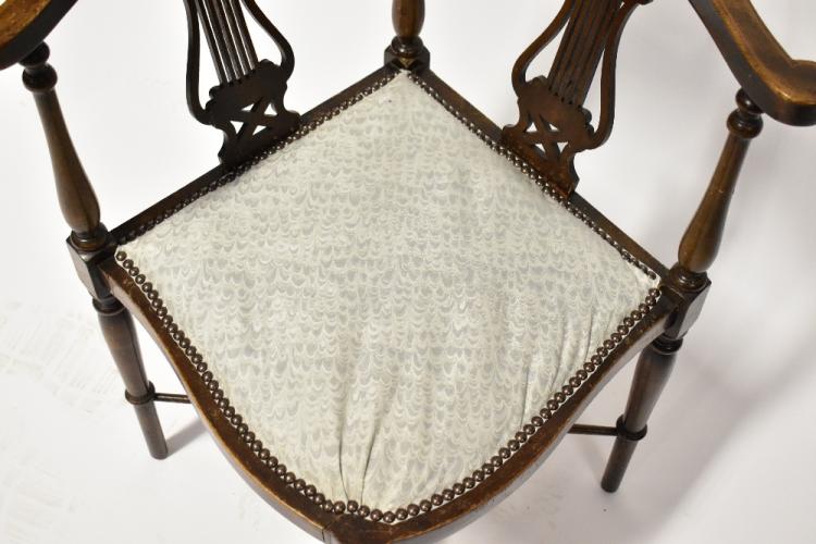 Lot 37 of 1061: An Edwardian mahogany and satinwood strung corner chair, with shaped back above turned uprights interspersed with lyre-shaped splats, raised on turned cross stretchered supports.