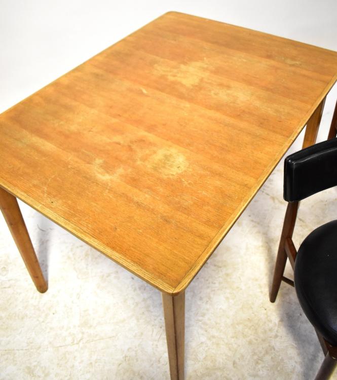Lot 60 of 1061: A 1960s vintage teak dining suite with crossbanded rounded rectangular extending table raised on tapering supports, 77 x 108 x 78cm (unextended), with single additional leaf, width 46cm and a set of four associated leatherette dining chairs (af) (5).