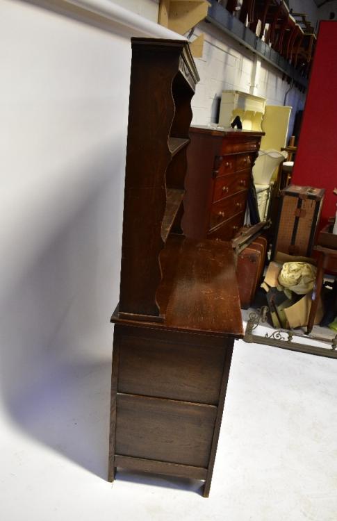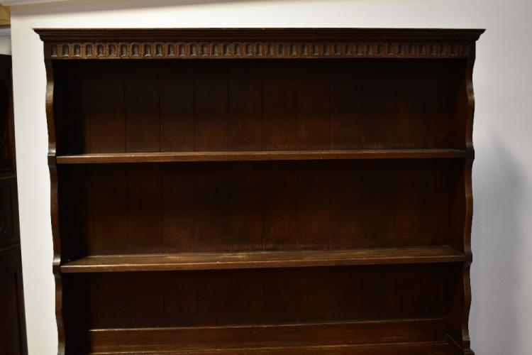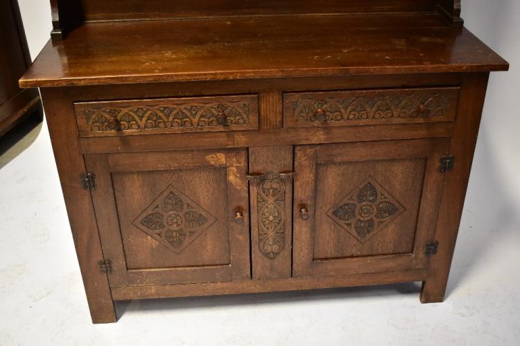Lot 80 of 1061: A modern reproduction oak dresser, on two-drawer, two-cabinet dresser base, with carved floral friezes and panels to the front, external hinges and square supports, 183 x 124 x 49cm.