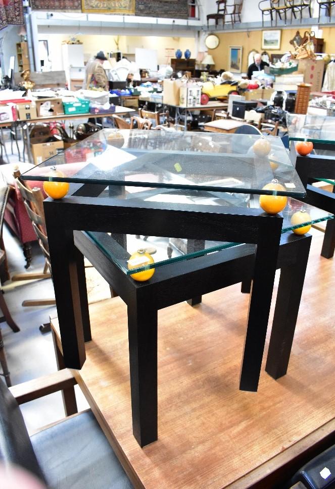 Lot 88 of 1061: A pair of modern stylised glass top bedside/occasional/coffee tables, the square glass top suspended above four orange balls, one to each corner, mounted on black painted wooden square frame, each 52 x 54 x 54cm (2).