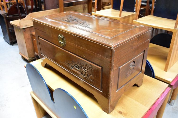 Lot 90 of 1061: A mid-20th century Oriental-style camphor chest with figural and scenic carved decoration to top and front, the lift-up top with ornate metal lock, to shaped clock supports, 52 x 92 x 45cm.