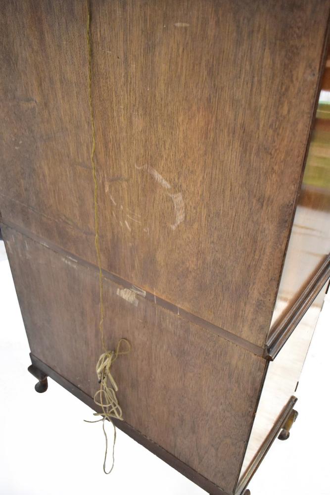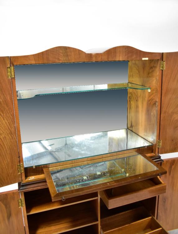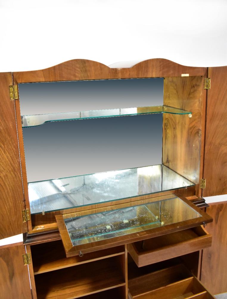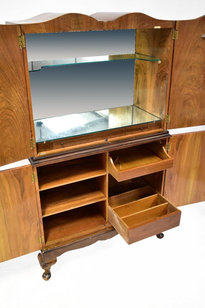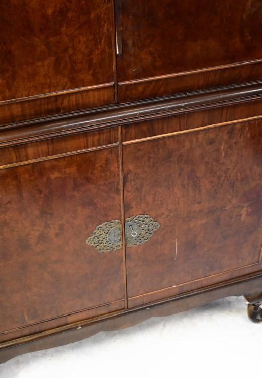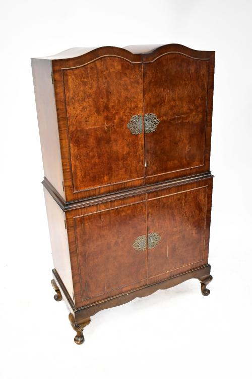 Lot 92 of 1061: A mid-20th century crossbanded burr walnut veneered double dome topped cocktail cabinet, with ornate lock escutcheons, the upper section with pair of panelled doors enclosing a mirrored interior with single glass shelf, mirrored brush-in slide, above further pair of panelled doors, raised on squat cabriole legs to pad feet, 158.5 x 92 x 44cm (af).