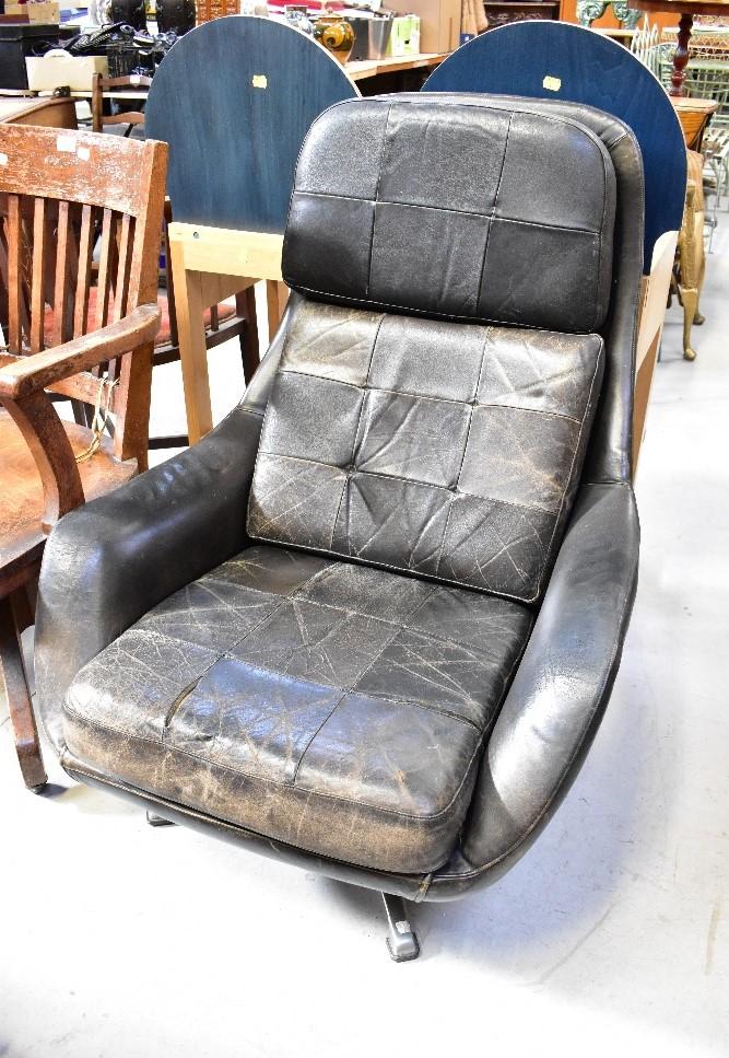 Lot 93 of 1061: A mid-20th century retro leather upholstered swivel armchair with button back seat, cushion and backrest, in need of restoration, on a chrome four-prong base, height 95cm.