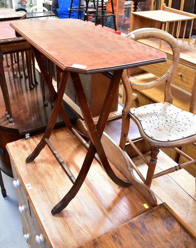 Lot 94 of 1061: A mid-20th century folding table, the mahogany-effect rectangular top with canted corners, on outswept legs, height 75cm.