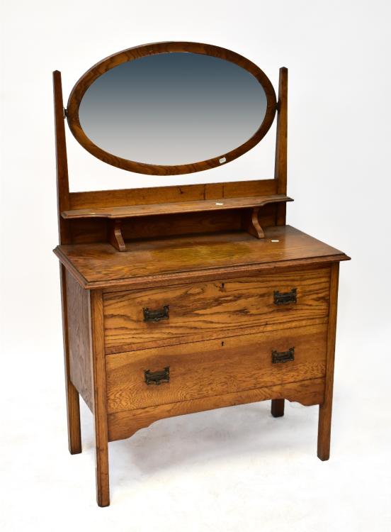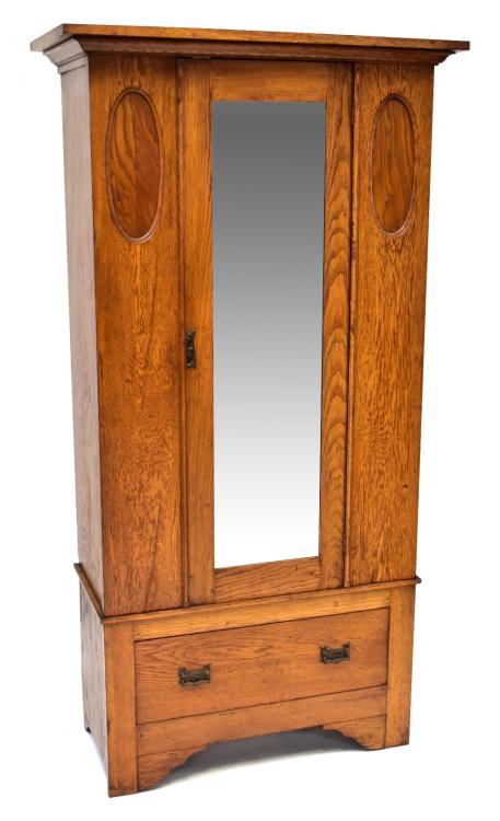 Lot 13 of 1493: An early 20th century oak two-piece bedroom suite comprising a wardrobe with single mirrored door set with bevelled plate, flanked by pair of oval roundel decorations above a single base drawer, raised on bracket feet, 190 x 99 x 47cm (possible later top), together with a similar two-drawer dressing chest set with oval bevelled mirror above a shallow shelf, two long drawers, raised on stile supports (2).
